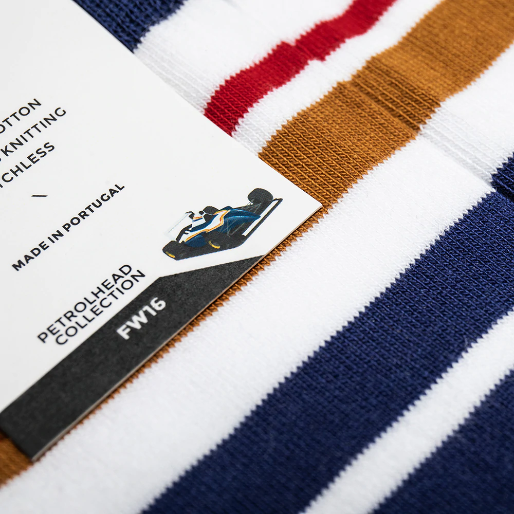 Der Williams FW16 nahm an der Formel-1-Saison von 1994 teil und brachte dem britischen Fahrer Damon Hill die Weltmeisterschafft. Tragischerweise war er auch der Wagen in dem Ayrton Senna beim dritten Rennen der 19994-Saison ums Leben kam. Hier ist unser Tribut an den größten F1-Fahrer aller Zeiten. Die Inspiration für das Sockendesign kam durch die Rothmans Sponsoren-Lackierung.